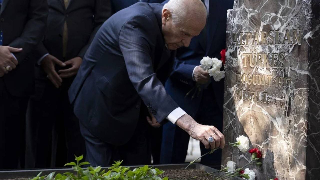 Kur'an-ı Kerim tilavetinin ardından Bahçeli, Türkeş'in kabrine kırmızı ve beyaz karanfiller bıraktı, bakır ibrikle su döktü.