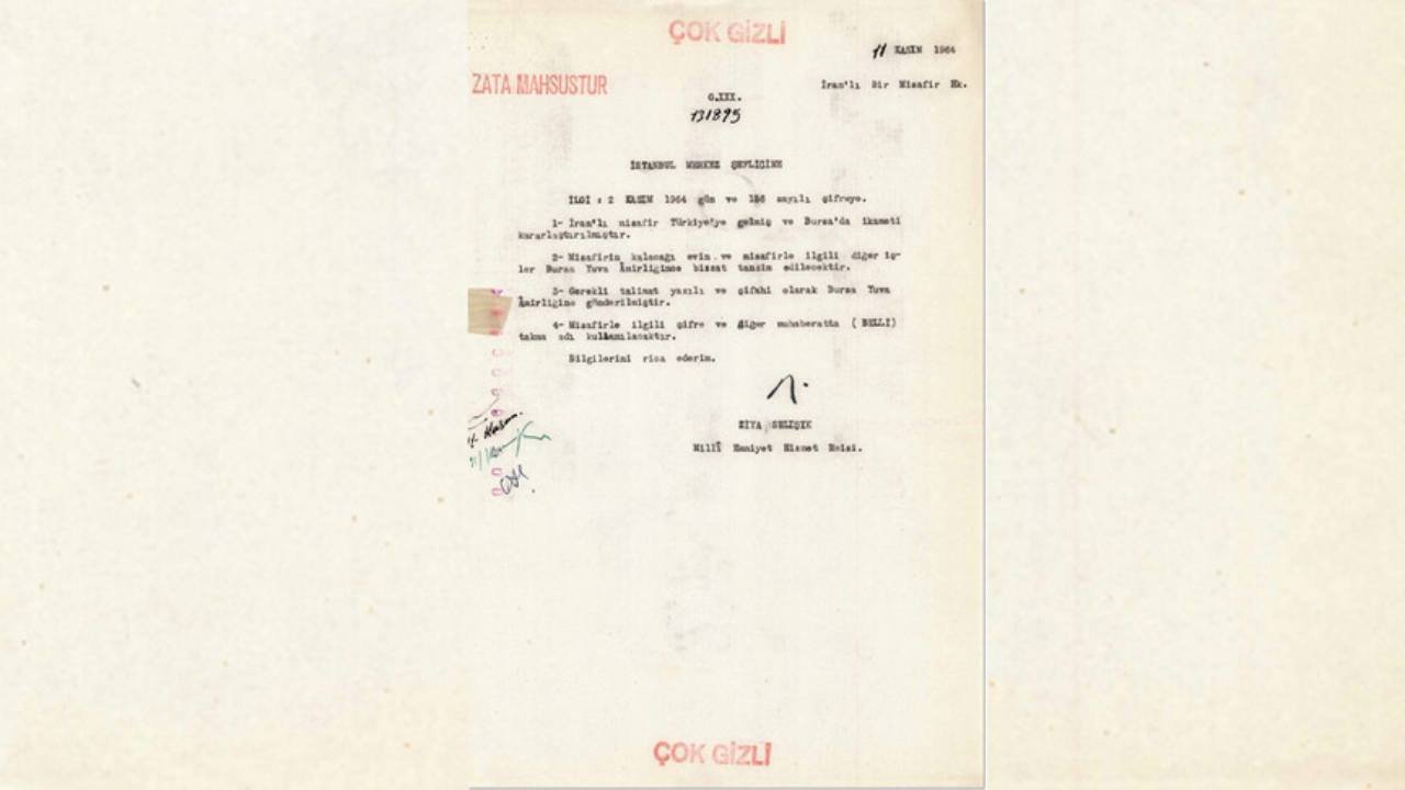 "İranlı misafir Türkiye'ye gelmiş ve Bursa'da ikameti kararlaştırılmıştır. Misafirin kalacağı evin ve misafirle ilgili diğer işler Bursa Yuva Amirliğince bizzat tanzim edilecektir. Gerekli talimat yazılı ve şifahi olarak Bursa Yuva Amirliği'ne gönderilmiştir. Misafirle ilgili şifre ve diğer muhaberatta 'belli' takma adı kullanılacaktır. Bilgilerini rica ederim."