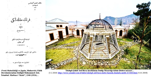 Solda, Şehîd Âtıf Hoca’nın Şapka İktisâsı Kânûnu’ndan 16 ay evvel neşrettiği, buna rağmen îdâmına mesned yapılan Frenk Mukallidliği ve Şapka risâlesi… Sağda, İskilip’te Gülbaba Mezarlığı’ndaki âbidevî kabri… Îdâmını müteâk̆ib defnedildiği yer, mechûl kalmıştı. Kabri, Hatay Sâbık Millet Vekîli Dr. Mehmet Sılay (Hatay, 1949) öncülüğünde bir ekipin ısrârlı araştırmalarıyle, 2010’da, Ankara-Mamak Kimsesizler Mezarlığı’nda keşfedildi ve toplanabilen kemikleri 2011’de İskilip’te Gülbaba Mezarlığı’na defnedildi. Bilâhare, üstüne, Frenk Mukallidi İdeol̃ojiye kahramanca muhâlefeti remzeden sarık şeklinde bir âbidevî mezar binâ edildi… Allâh, bu işte emeği geçenlerin ve Âtıf Hoca’yı, Babaeski Müftüsü Ali Rızâ Efendi’yi, mümâsili sayısız kahramanlarımızı sevenlerin cümlesinden râzı olsun ve bizi de şehîdlerimize lâyık kılsın!