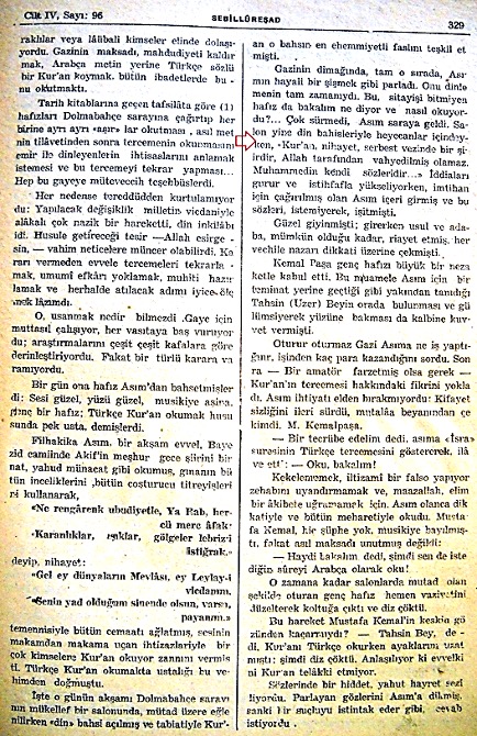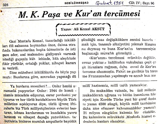 Hâfız Âsım Şâkir Gören’in Kemalist “Dîn İnkılâbı” ile alâkalı hâtırası hakkında Vâli Ali Kemâlî Aksüt’ün makâlesinin ilk sayfası... (Her ikisine da Allâh ganî ganî rahmet etsin!) Hâfız Âsım Efendi, “Türkce Kur'ân” tâlimi yaptırılmak üzere çağırıldığı Dolmabahçe Sarayı'nda Mustafa Kemâl'in şu sözleri sarfettiğine şâhid olmuş: “Kur'ân, nihâyet, serbest vezinde bir şiirdir! Allâh tarafından vahyedilmiş olamaz! Muhammed'in kendi sözleridir!”