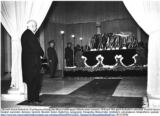 İşte 4 Kasım 1953’te, mumyalı cesedin bulunduğu tâbut, lahdin altında, medfûn bulunduğu beton odacıktan, Başvekîl Adnan Menderes’in, TBMM Reîsi Refik Koraltan’ın ve sâir resmî zevâtın nezâretinde, büyük bir îtinâyle ve huşû içinde, vinçlerle yukarı çekilmiş ve bu hâliyle katafalka konulmuştur. O târihten 10 Kasım 1953 târihine kadar, her gün ve muhtelif sâatlerde, sırasıyle, “Yüksek Öğretim öğrencileri; subaylar ve generaller ihtiram nöbeti” tutmuşlardır.