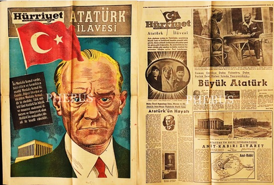 Simavi’lerin Hürriyet gazetesinin 10 Kasım 1953 târihli nüshasının 8 sayfalık “Atatürk İlâvesi”nin kapağı ve bunda, İnönü’nün Mustafa Kemâl’e “mektub”unun (“Büyük Atatürk”) münderic bulunduğu 3. sayfa… “Mektub”un üstündeki resimde, “Ebedî Şef”ile “Millî Şef”, bir masa etrâfında sohbet ederken görülüyor. Resim altı yazısı: “Işıklı gök mavisi gözleri bir insanın üzerine çevrildi mi muhakkak büyülerdi. Kuvvetli çenesi, sıkı dudakları ve yüzünün bariz adaleleri Atatürk’ün çelik iradesini meydana koyardı. Yukarıda büyük Ata, silâh ve inkılâp arkadaşı İsmet İnönü ile bir istirahat anında görülüyor.”