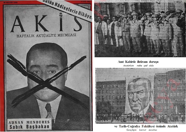 İsmet İnönü’nün dâmâdı Metin Toker’in haftalık siyâsî mecmûası Akis’de, Kemalist Totaliter İdeolojiden mülhem 27 Mayıs 1960 İhtilâli… Resim altı yazıları: “Atatürkün ruhu şad oldu…” “Gençliğin kuvvet menbaı…” Serbest seçimlerle iş başına gelmiş Hükûmeti ajitasyon yaparak ve zor kullanarak devirmenin “meşrûiyet mesnedi”, Kemalizm!