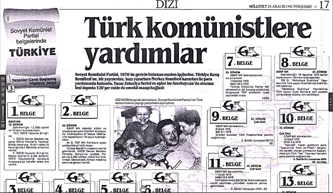 Türkiye’de Kemalist ve Komünist hareketlerinin öncü kadrosuna mensûb Sertel’ler ve sâir Komünistler hakkında pek ibretâmîz bir vesîka: “Sovyet Komünist Partisi, 1978’de, grevde bulunan maden işçilerine, Türkiye Barış Komitesi’ne, bir yayınevine, bazı yazarlara Merkez Komitesi kararı ile para yardımında bulundu. Yazar Zekeriya Sertel ve eşine ise, Azerbaycan’da oturma izni dışında, 120’şer ruble de emekli maaşı bağladı.” (Cenk Başlamış ve Vladimir Jarov, Milliyet, 24 Aralık 1992, s. 17)