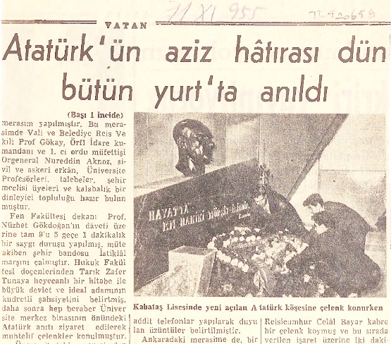 Bu gazete haberinden, Kabataş Erkek Lisesi’nin -bizim de, 1963/65 “10 Kasım”larında, önünde resmigeçid yaptığımız- “Atatürk Köşesi”nin 1955’te açıldığını öğreniyoruz…