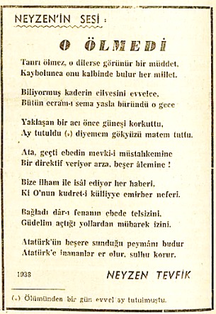 • Yalman’ın gazetesinin aynı nüshasının 4. sayfasına, Gazetenin havasına uygun olarak, bir de Neyzen Tevfik̆’in “O Ölmedi” başlıklı şiiri dercedilmiştir. Bu da tam bir taabbüd şiiridir: