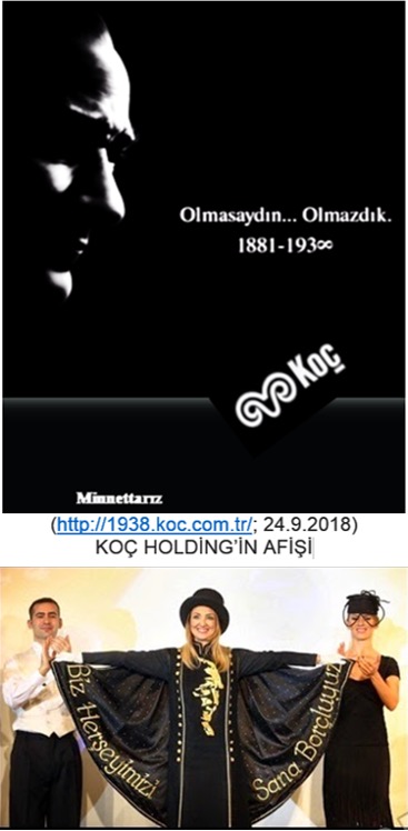 • Mütehakkim Zümrenin başlıca unsurlarından Koç Holding, gâlibâ 2012’de, şehir duvarlarını, üzerinde Mustafa Kemâl’in çehre fotoğrafının bulunduğu bir perestiş afişiyle kaplamıştı. Üzerinde şu slogan vardı: