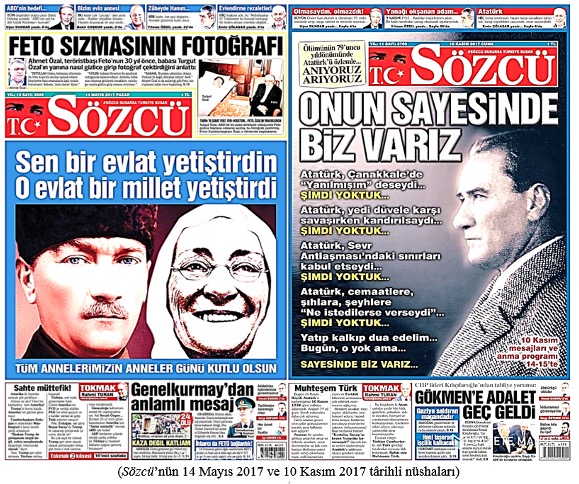- 14 Mayıs 2017 târihli Sözcü’nün manşeti: “Sen bir evlat yetiştirdin, o evlat bir millet yetiştirdi…” Manşetin altında iki portre fotoğrafı: Solda Mustafa Kemâl, sağda Zübeyde Hanım… Fotoğrafların altında: “Tüm annelerimizin anneler günü kutlu olsun”…