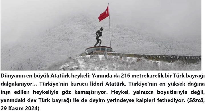 “Bu devasa yapıt, Türkiye'nin tarihi mirasına olan bağlılığı simgelerken, aynı zamanda Atatürk’ün azim ve kararlılığını da yüceltiyor.” (Sözcü gazetesinin haberi, 29.11.2024; https://www.sozcu.com.tr/dunyanin-en-buyuk-ataturk-heykeli-yaninda-da-216-metrekarelik-bir-turk-bayragi-dalgalaniyor-p108890; 2.12.2024)