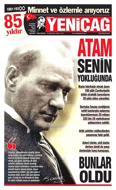 • 10 Kasım 2023 târihli Yeniçağ, bütün birinci sayfasında, Türkiye’nin mevcûd hâlini, -herhâlde bir yardım ümîdiyle- “Ebedî Şef”e şikâyet ediyor: “Atam, senin yokluğunda bunlar oldu: Başta fabrikalar olmak üzere 100 yıllık Cumhuriyetin bütün stratejik kurumlarını 20 yılda elden çıkardılar… Kurtuluş Savaşı verdiğimiz şehit kanlarıyla sulanmış topraklarımızın 28 milyon 320 bin 28 metrekaresi yabancılara satıldı… Artık şehirler mültecilerden yaşanmaz hale geldi… Askerî darbe, sivil darbe derken şimdi de yargı darbesiyle karşı karşıyayız…”