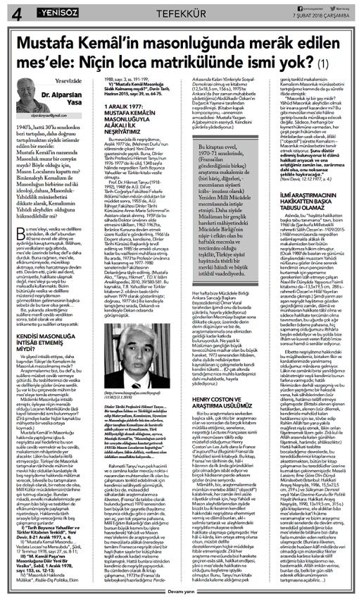 Mustafa Kemâl’in Masonluğunda Merâk Edilen Mes’ele: Nîçin Loca Matrikülünde İsmi Yok?; Yeni Söz, 7 Şubat – 15 Nisan 2018, her gün tam sayfa 68 tefrika.