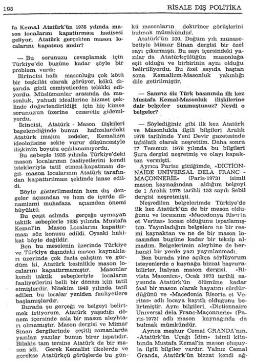 - Müteâk̆ib neşriyâtımız, dokuz sene kadar sonra, Hasan Hüseyin Ceylan’ın ısrârı üzerine, Masonluk hakkında, kendisinin neşrettiği üç aylık Risale-Dış Politika’ya verdiğimiz mufassal mülâkat oldu. Ne yazık ki Ceylan, verdiği kat’î söze uymıyarak, mülâkatımızın hem cüz’î bir kısmını neşretti, hem de onu fecî şekilde tahrîf etti. Dokuz sayfaya indirilmiş muharref mülâkatımızın künyesi aşağıdadır: