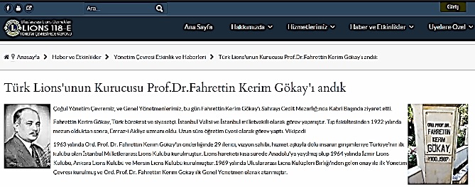1932 ve 1934-1935’te Murat Mahfili Üstâd-ı Muhteremi, Türkiye siyâsî hayâtının mühim bir şahsıyeti ve Türkiye Lions Kulüplerinin müessisi, Fanatik Kemalist Fahreddin Kerim Gökay hakkında Türkiye Lions Kulüblerinin Sitesinde bir haber… Resmin sağında, Gökay’ın Sahrâ-i Cedîd Mezârlığı’ndaki Fâtiha’sız kabri görülüyor… (Lions Kulübleri, aynen Rotary Kulübleri gibi, İngiltere Masonluğunun nüfûzu altındaki beynelmilel iki Masonumsu teşkîlâttır… Bunların hepsi, şu veyâ bu şekilde Beynelmilel Siyonizme hizmet eden müesseselerdir.)