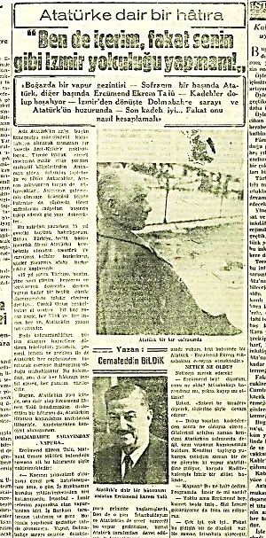 “Dolup boşalan kadehlerden sonra ne olduysa olmuş. Gözlerimi açtığım zaman kendimi Atatürkün sofrasında değil, aynı vapurun kamarasında buldum. Kendimi toplayıp yukarı çıktığım zaman bir de ne göreyim ki vapur alabildiğine gidiyor, karşıda Kadifekalesiyle İzmir bir siluet halinde…