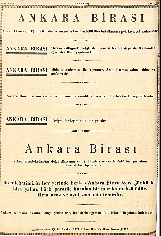 Haydar Rüşdü Öktem’in Sâhibi ve Başmuharriri olduğu, İzmir’de münteşir Anadolu gazetesinde, Ankara Birası’nın tam sayfa reklamı…