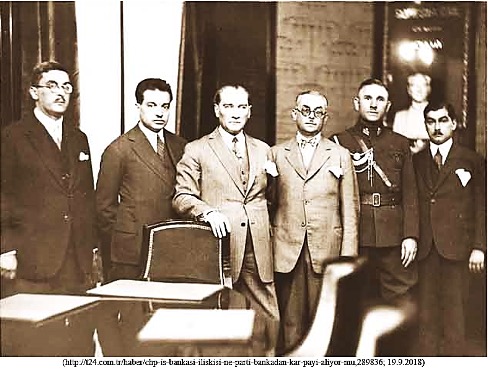 22 Ekim 1929’da İş Bankası’nı ziyâreti esnâsında… Solunda Celâl Bayar, sağında (10 Şubat 1935’de, İstanbul Çengelköyü’nde, cürm-ü meşhûd hâlinde cinâyetten yakalandığı hâlde, 33 dereceli Mason Dr. Fahrettin Kerim Gökay’ın aklî muvâzenesizlik raporu vererek mahk̃ûmiyetten kurtardığı, bu vâkıaya rağmen “Tek Adam” tarafından Sinob Meb’ûsu tâyîn edilen ve 1923’ten 1939’a kadar dört devre Sinob Meb’ûsluğu yapan) Recep Zühtü Soyak… (Mustafa Kemâl’in birçok yârânı gibi muhtemelen Sabataî olan Manastırlı Recep Zühtü -1893/1963- hakkında Hasret Yıldırım’ın Yeni Söz’ün 10 ve 11 Haziran 2017 târihli nüshalarında intişâr eden makâlesi gâyet aydınlatıcıdır.) Mustafa Kemâl’in –Recep Zühtü’den mâadâ, Mahmut Soydan, Salih Bozok, Kılıç Ali, Nuri Conker, Cevat Abbas gibi- birçok mûtemed adamı İş Bankası kadrosuna dâhildi… (Bu son husûs için bkz. Ömer Asan, “İş Bankası Kurucu ve Hissedarlarını Açıklıyoruz”, 17.9.2018; https://gazeteistanbul.com/is-bankasi-kurucu-ve-hissedarlarini-acikliyoruz/; 25.9.2018.)