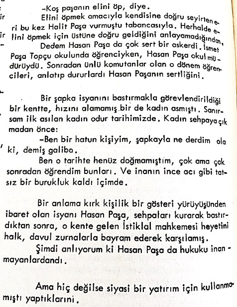 “Bir şapka isyanını bastırmakla görevlendirildiği bir kentte, hızını alamamış, bir de kadın asmıştı. Sanırsam [siyâseten] ilk asılan kadın odur tarihimizde. Kadın sehpaya çıkmadan önce: