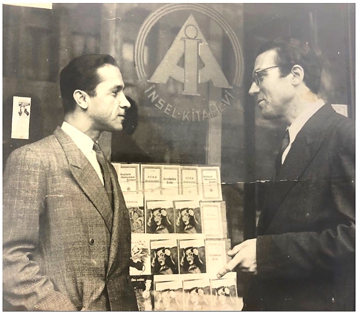 Dr. Hasan İnsel: “Babam editör Avni İnsel ve yakın dostu yazar Orhan Veli Kanık, İnsel Kitabevi’nin önünde sohbet ederken. Yer istanbul, Ankara caddesi No:109, yıl sanırım 1949.” (https://www.instagram.com/p/ChY5C9po7RF/9; 12.10.2025)