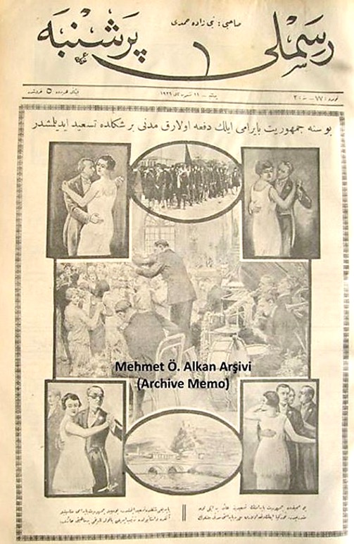 Sabiha Derviş Sertel ve ağabeylerine âid Resimli Ay Matbaası T.L.Ş.'nin neşrettiği Resimli Perşenbe'nin 11 Teşrînisânî 1926 târihli nüshası… Kapaktaki manşet yazısı: “Bu sene Cumhûriyet Bayramı, ilk def'a olarak medenî bir şekilde tes'îd edilmişdir”… Frenk mukallidliğinden ibâret bir ideolojinin “medeniyet” telak̆k̆îsi budur: Şapka, balo, iffetsizlik…