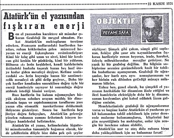“Fevkalbeşer” “Büyük Şef”ini daha hangi sıfatlarla tebcîl edeceğini bilemiyen Hakîkatsiz Muharrir ve Mütercim, bir kısmını toptan veyâ kısmen sansür, bir kısmını tahrîfen tercüme ettiği “Madam Corinne’e Mektublar”ı neşrettiği günlerde, yeni bir keşfini îlân etti: Mektublardaki “el yazısından enerji fışkırıyor” imiş! Binâenaleyh grafologlar seferber olmalı, “Fevkalbeşer Varlığın” “nûr ve ateş dolu rûhuna biraz daha yaklaşabilmek için” bu el yazılarını tedk̆îk̆ etmeli imişler! (Mustafa Kemâl’in Hastalığı, Ölümü, Cenâzesi; Yeni Söz, 26.10.2019/395)