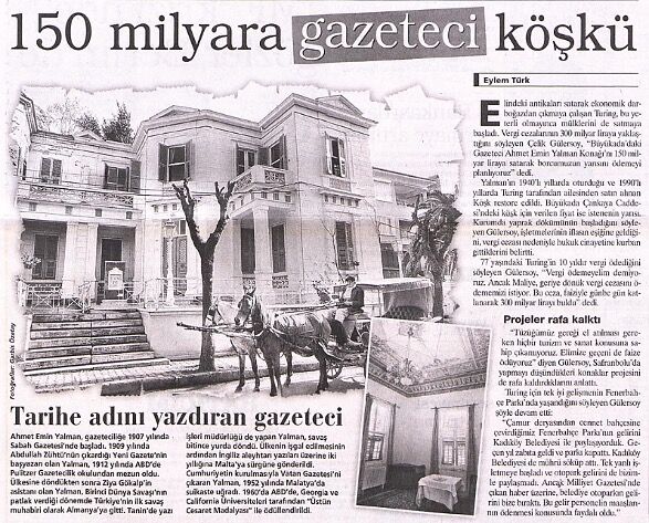 “Yalman’ın 1940’lı yıllarda oturduğu ve 1990’lı yıllarda Turing tarafından ailesinden satın alınıp restore edilen köşk”üne, 2000 senesinde 150 milyar TL kıymet biçiliyordu…