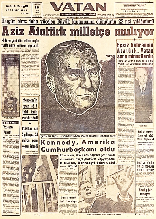 Mütehakkim Zümrenin en nüfûzlu sîmâlarından Ahmed Emin Yalman’ın Vatan gazetesinin 10 Kasım 1960 târihli pek ibretâmîz nüshası… (Bu nüshanın en ibretâmîz tarafı: “20. Asrın Sabatay Sevi’si” yerine koydukları “İl̃âh”larının, “Yaşayan Kuvvet” olarak, “Anıt-Kabir’deki Umûmî Karârg̃âhı”ndan Memleketimizi idâreye devâm ettiği vâkıasıyle iftihâr etmeleri…)