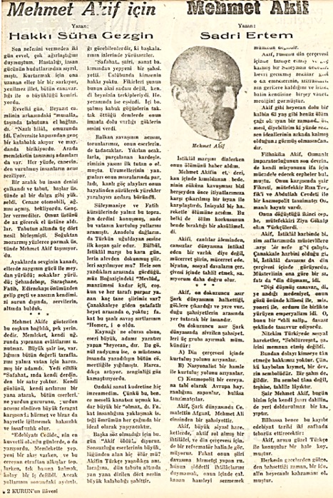 Kurun’un 30 Aralık 1936 târih ve 37 sayılı “Güzel Sanatlar, Kadın, Moda, Sinema” ilâvesinin 2. sayfasında, Mehmed Âkif hakkında, yan yana iki makâle mündericdir. Bunlardan biri Hakkı Süha Gezgin’in, dîğeri Sadri Ertem’in kaleminden çıkmıştır. Bunlardan ikincisi, oldukça sathî muhtevâlı olduğundan, sâdece birincisini kısmen nakletmek istiyoruz.