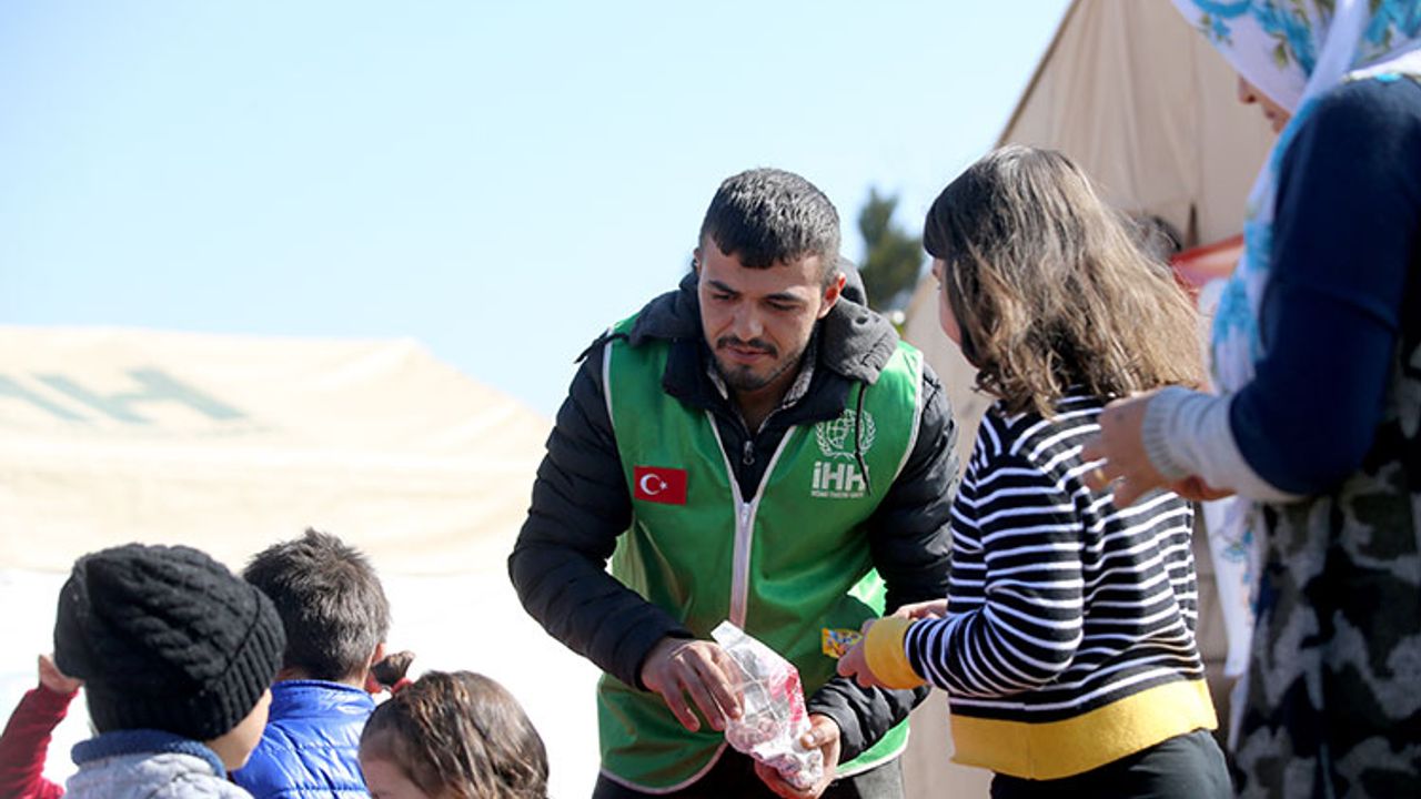 İlçede yaklaşık 5 gün arama kurtarma çalışmalarına katılan iki arkadaş, şimdi de İHH tarafından Aslanlı Mahallesi'nde kurulan çadır kentte hazırlanan yemekleri depremzedelere dağıtıyor.