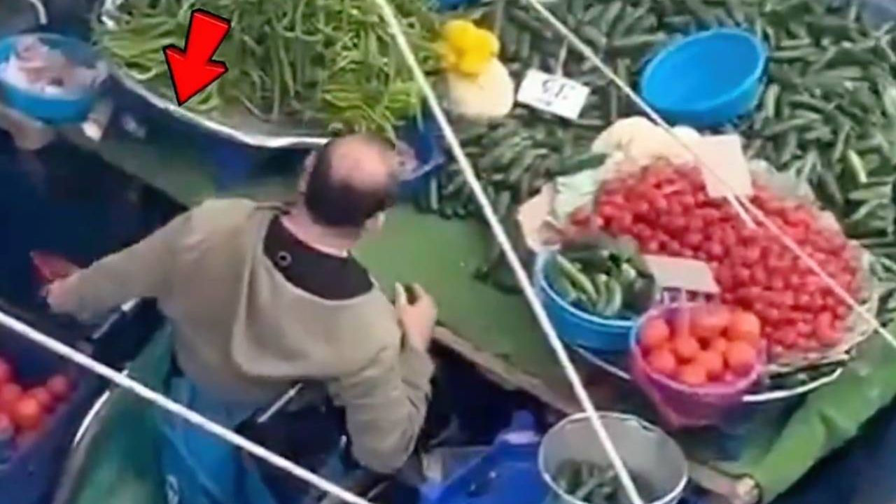 Engelli bir pazarcının, müşterinin özenle seçtiği salatalıkları el çabukluğuyla kenara ayırıp yerine daha önce hazırladığı farklı ürünleri verdiği anlar kameraya yansıdı.