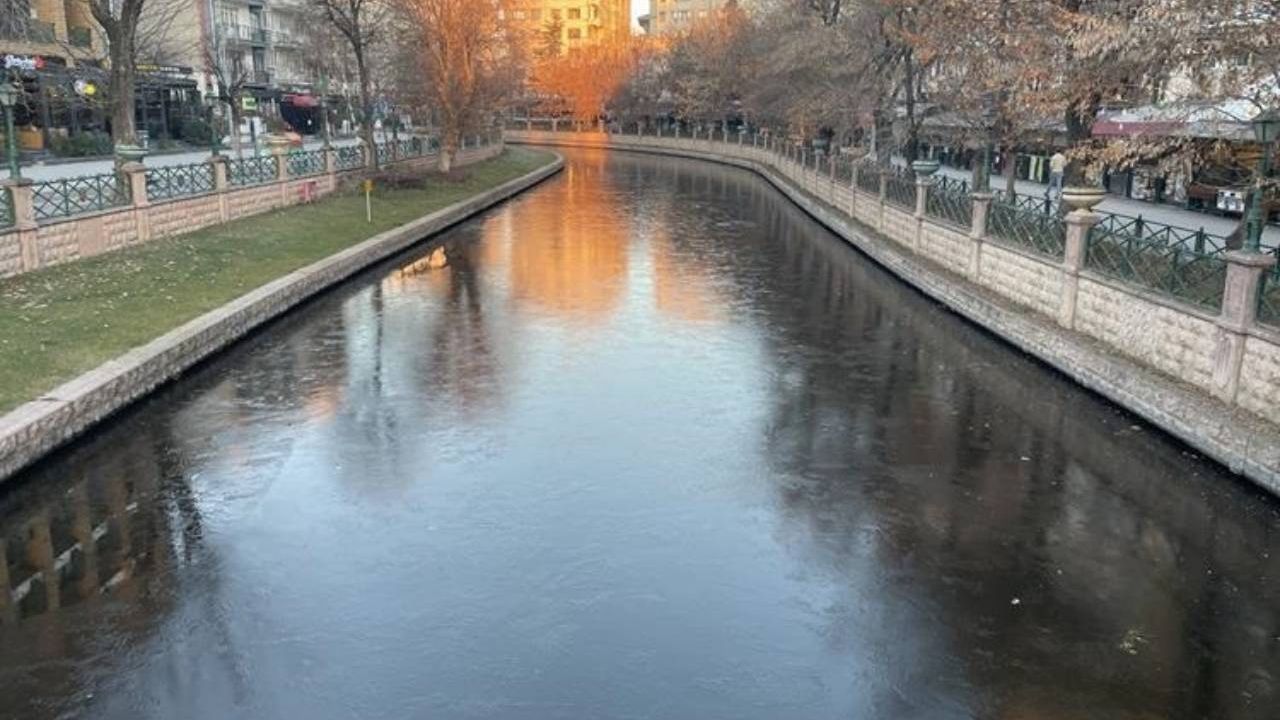 Soğuk havanın etkisiyle Porsuk Çayı'nın yüzeyi buz tabakasıyla kaplandı.
