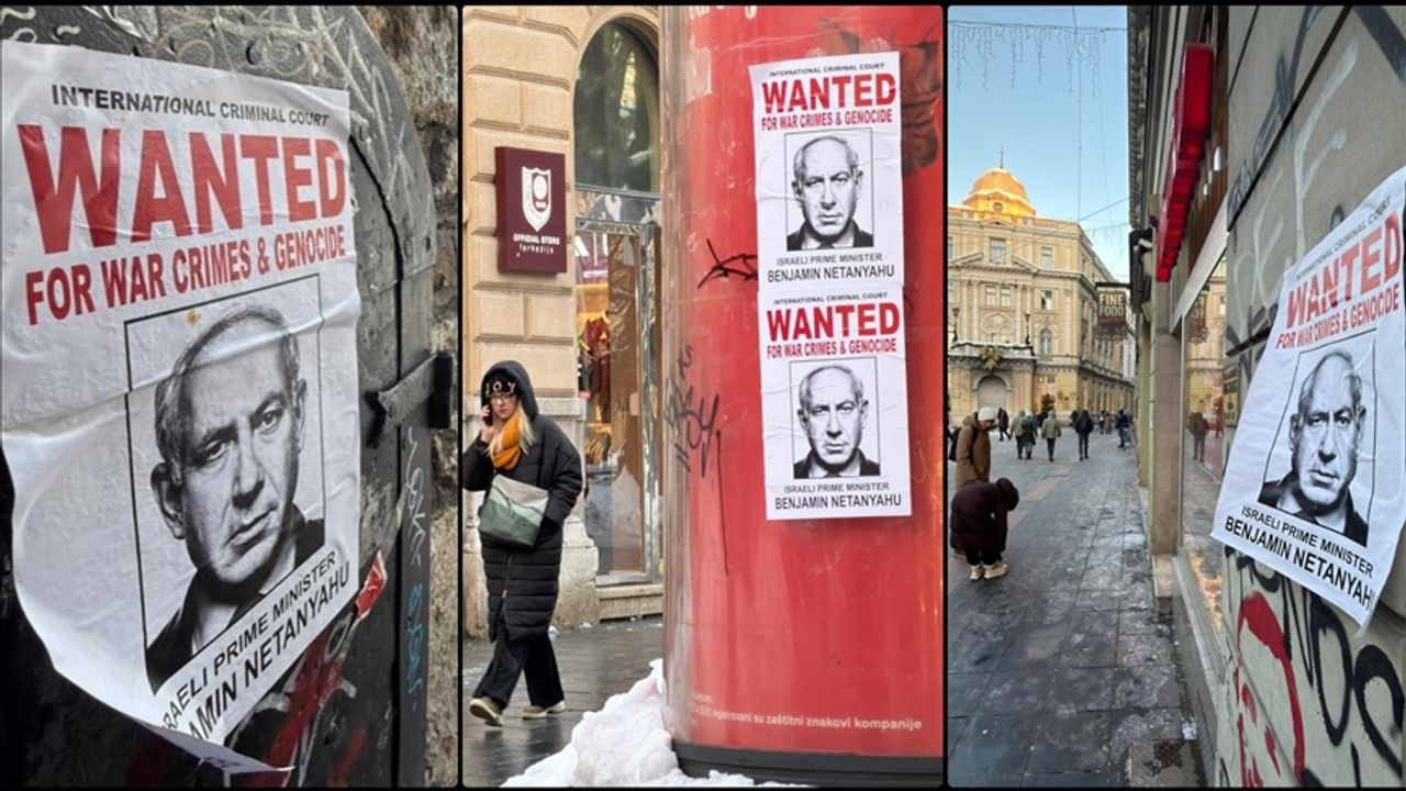 Bir grup insan hakları aktivisti tarafından asılan afişlerde, Netanyahu'nun fotoğrafı yerleştirilerek üzerinde "Uluslararası Ceza Mahkemesi" yazısı yer alırken, alt kısımda da "Netanyahu, aranıyor, savaş suçları ve soykırımdan" ifadelerine yer verildi.