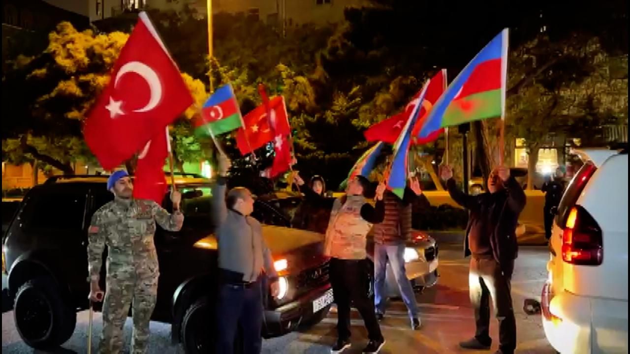 Türkiye'nin Bakü Büyükelçiliği önünde oluşturulan konvoyla kutlama yapıldı.