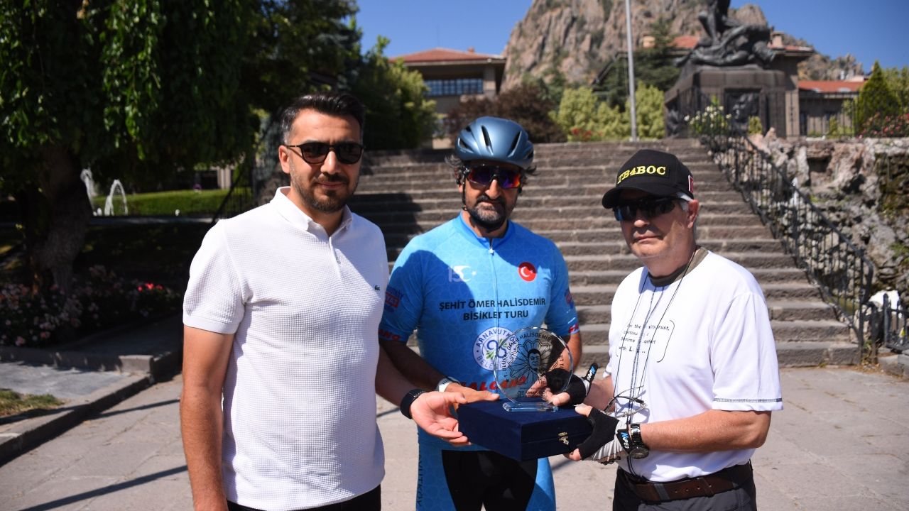 Fetullahçı Terör Örgütü'nün (FETÖ) 15 Temmuz 2016'daki darbe girişiminde şehit düşenleri ve yaralananları anmak amacıyla bu yıl 9'uncusu düzenlenen bisiklet turuna katılan sporcular, Anıtpark önünde Türkiye Bisiklet Federasyonu Afyonkarahisar Temsilcisi Osman Çoban tarafından karşılandı.