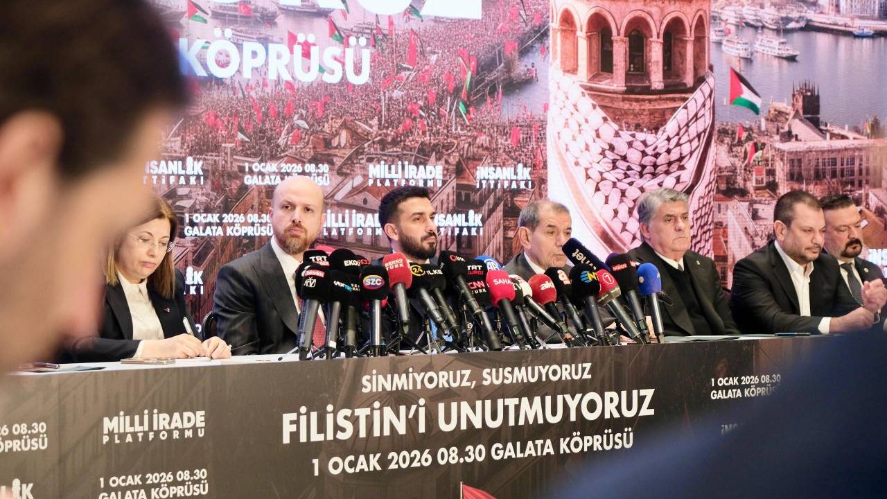 TÜGVA Genel Başkanı İbrahim Beşinci, “Bugün 21. Yüzyılda 7 aylık bir bebek soğuktan çadırında donarak ölüyorsa hangi sistemden hangi adaletten bahsedebiliriz? Dünya barışını Batı'nın kukla liderlerinin insafına terk etmemeliyiz. 1 Ocak 2026 sabahı saat 08.30'da unutmadığımızı göstermek için Galata Köprüsü'ne gelin. Anneler, babalar, gençler suskunluğun duvarını yıkmaya gelin. Tüm dünyaya sesleniyoruz. 1 Ocak tarihinde milyonları Galata Köprüsü'nde Büyük Gazze yürüyüşüne davet ediyoruz” dedi.