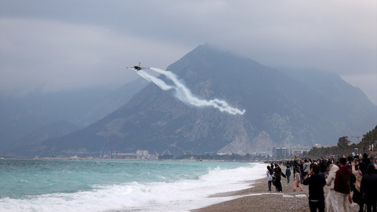 Antalya Valiliği ile Büyükşehir Belediyesi işbirliğinde düzenlenen etkinlik için Konyaaltı Sahili Olbia Meydanı önünde toplanan vatandaşlar, F-16 uçağıyla yapılan gösteriyi ilgiyle izledi.