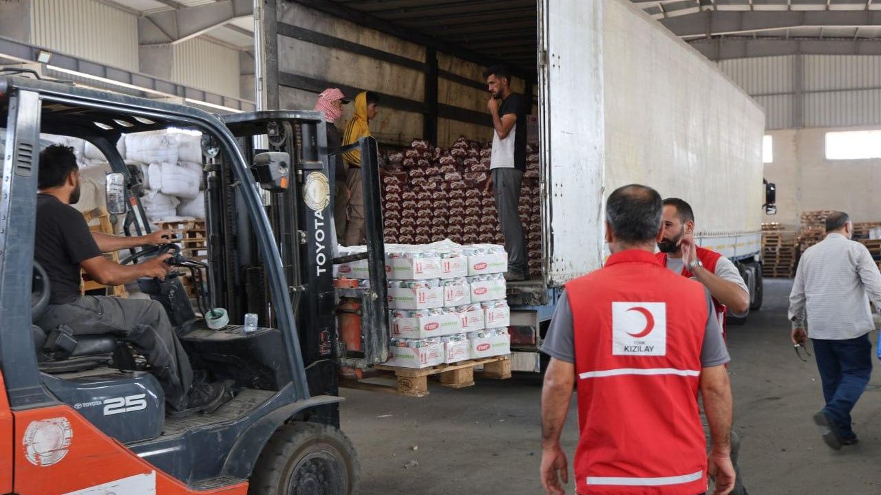 Türk Kızılay tarafından hazırlanan ve içerisinde gıda kolisi, hazır gıda, su ile çocuk bezi bulunan 2 tır insani yardım malzemesi, Suriye Kızılayına teslim edildi.