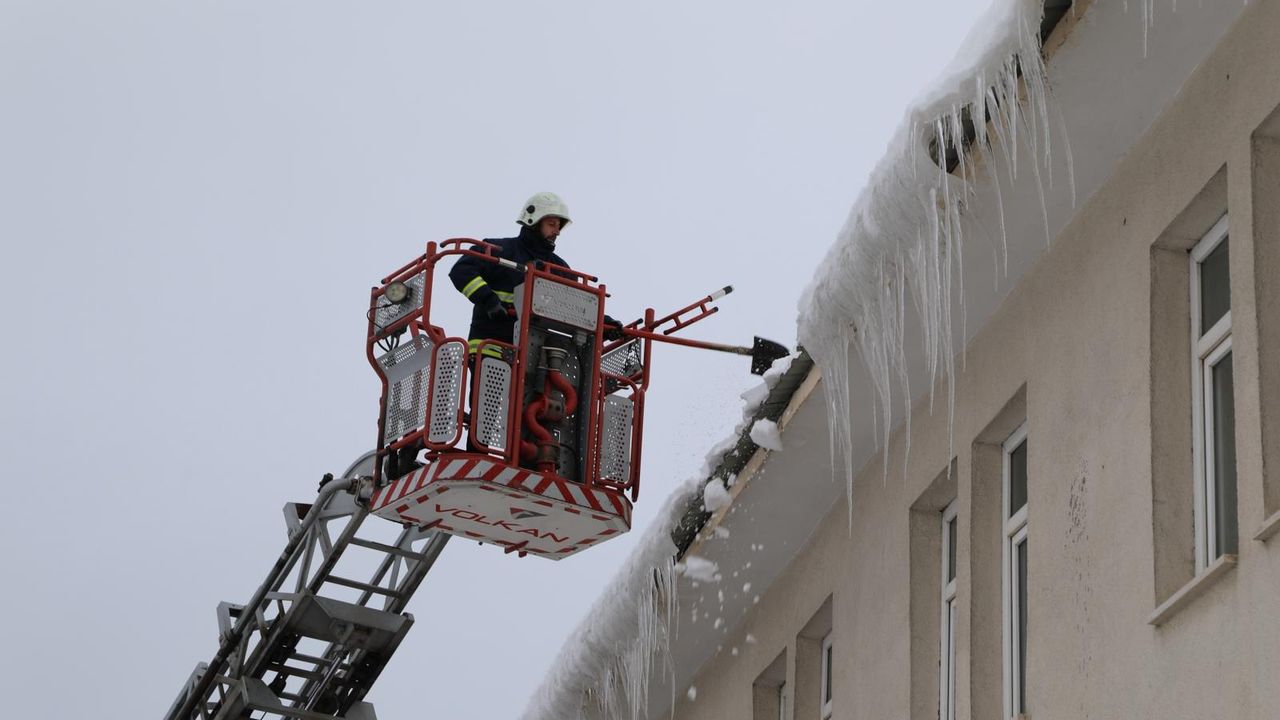 İtfaiye ekipleri de okullarda öğrenci ve eğitimcilerin güvenliği için okul binalarının çatıları ve girişlerinde tehlike oluşturan yaklaşık 1 metreyi bulan buz sarkıtlarını kontrollü şekilde kırarak temizledi.