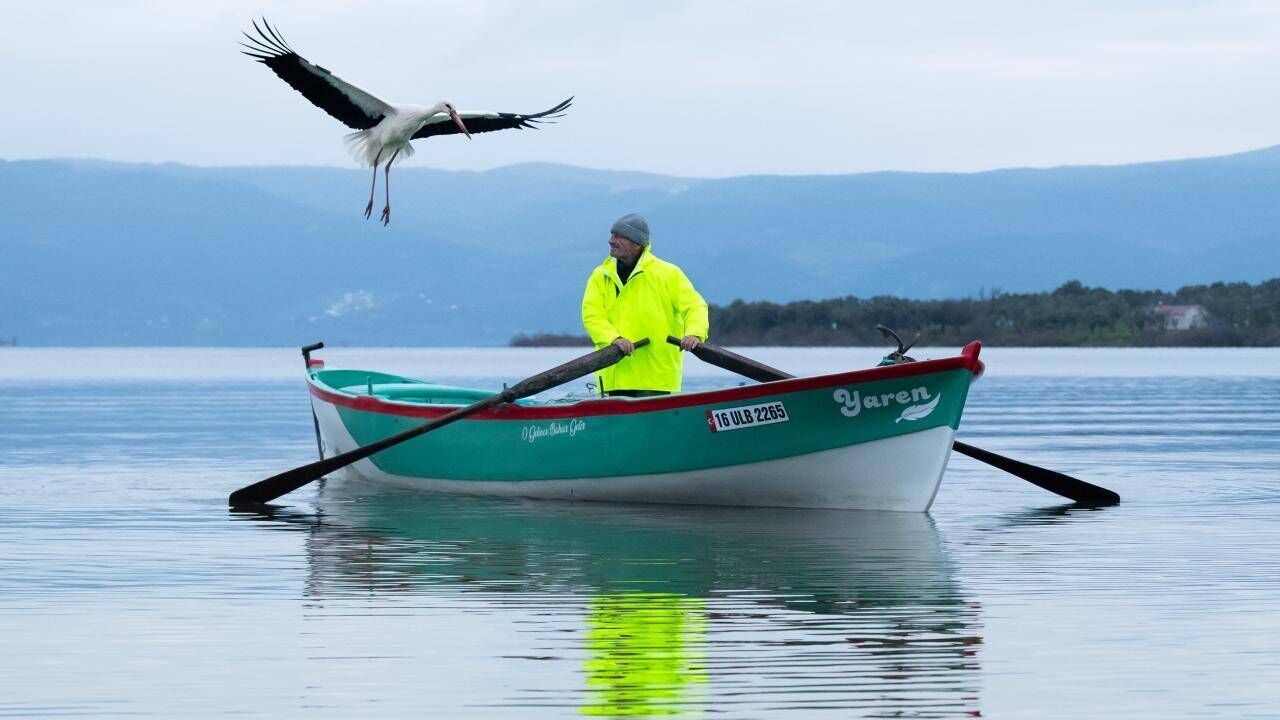 Yaren leyleğin, göl manzaralı yuvasının bulunduğu mahallede balıkçı Yılmaz'ın kayığındaki geleneksel pozu, doğa ve yaban hayatı fotoğrafçısı Alper Tüydeş tarafından kayda alındı.