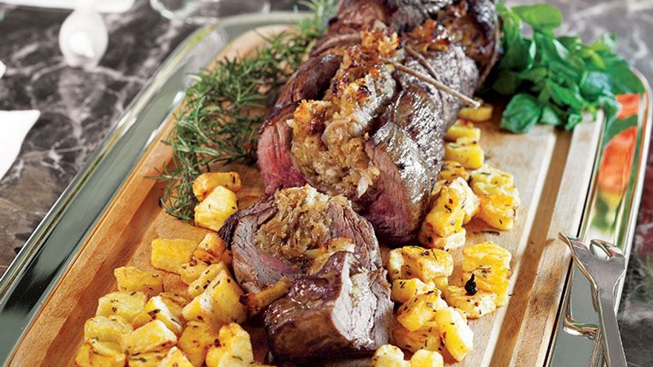 Bonfileyi büyük boy bir buzdolabı poşetine alın. Marinat malzemesiniekleyin ve ağzını bağlayın. Torbayı biraz ters düz edip sos malzemesinin etin her tarafına bulaşmasını sağlayın. 1-2 saat oda ısısında bekletin. Zeytinyağını tavada ısıtın. Soğanları ekleyip orta ateşte 3-4 dakika karıştırarak pişirin. Şekeri üzerine serpin. Balzamik sirkeyi ilave edip 5 dakika daha pişirin. Patatesleri ekleyip biraz tuz ve karabiber serpin. 7-8 dakika pişirin. Tavayı ocaktan alın. Adaçayını ve ekmekleri ilave edin. Geniş bir tavayı ısıtın. Etin iki tarafını da yüksek ateşte çevirerek kızartın. Fırını 200 derecede ısıtın. Keskin bir bıçakla eti sandviç ekmeği gibi boydan boya kesin (tamamen ikiye ayırmayın sadece bir tarafından kesin). Ekmekli karışımı arasına yerleştirin. Açılmaması için fırın ipiyle bonfileyi bağlayın. Eti bir fırın kabına alın ve 35-40 dakika pişirin. İplerini çıkarıp dilimleyin. Tuz ve karabiber serperek servis yapın.